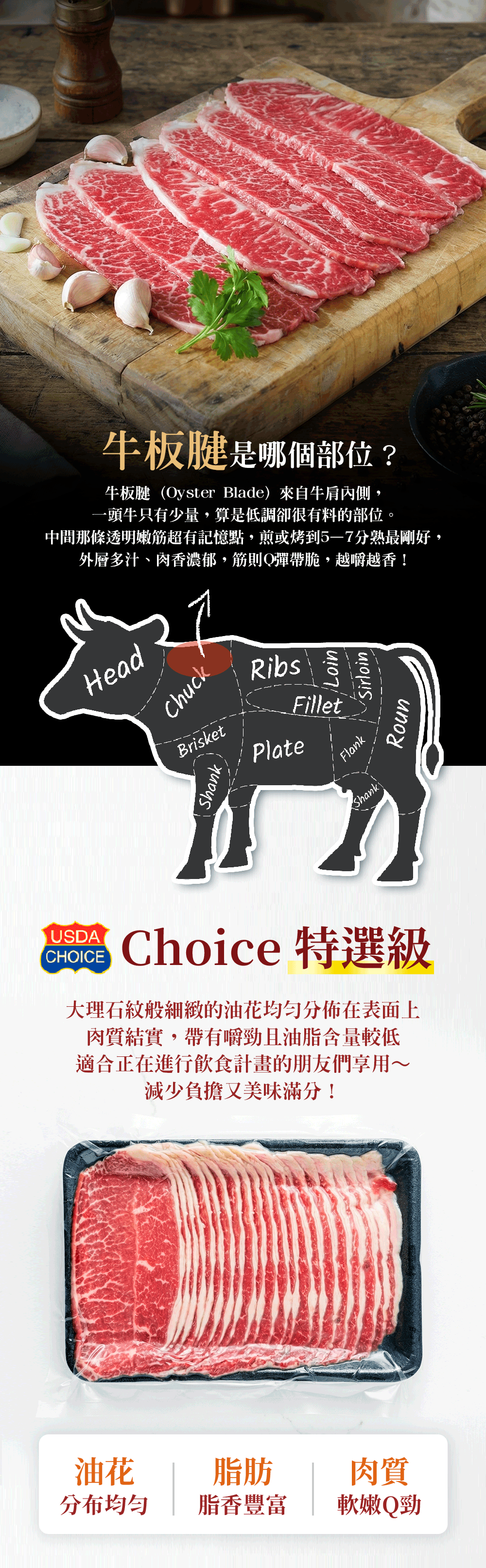 板腱是位於牛肩胛部位的肉,一頭牛僅能取出大約兩公斤的板腱,板腱的特色是中間有一根透明的嫩筋,所有牛肉部位獨有的,不同於嚼不動的白筋,煎烤過後的筋,吃起來,「脆彈」,非常Q彈!板腱肉脂肪少,肉較結實有嚼勁~ ●肉質紮實伴隨濃郁香氣,咬下更是嫩中帶Q的絕佳嚼勁 ●油花少、熱量低,正在健身或飲控的朋友們也能放心大口吃 ●煮火鍋、上烤盤或是大火快炒,千變萬化的都好吃