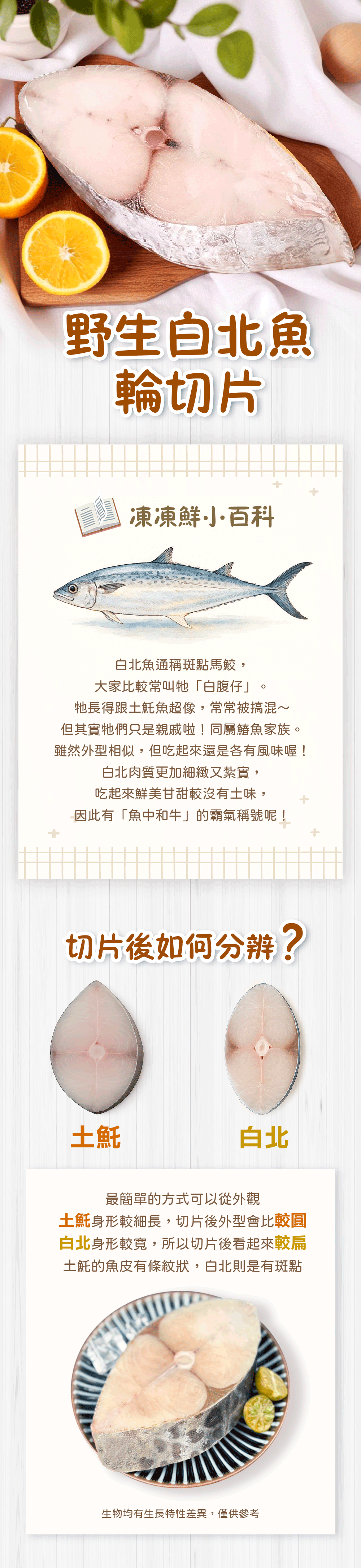 白北魚通稱斑點馬鮫,大家更習慣叫牠「白腹仔」。長得跟土魠魚超像,常常讓人傻傻分不清~其實牠們只是「親戚」關係啦!都屬於鰆魚家族。雖然外型相似,但吃起來可是各有風味喔!